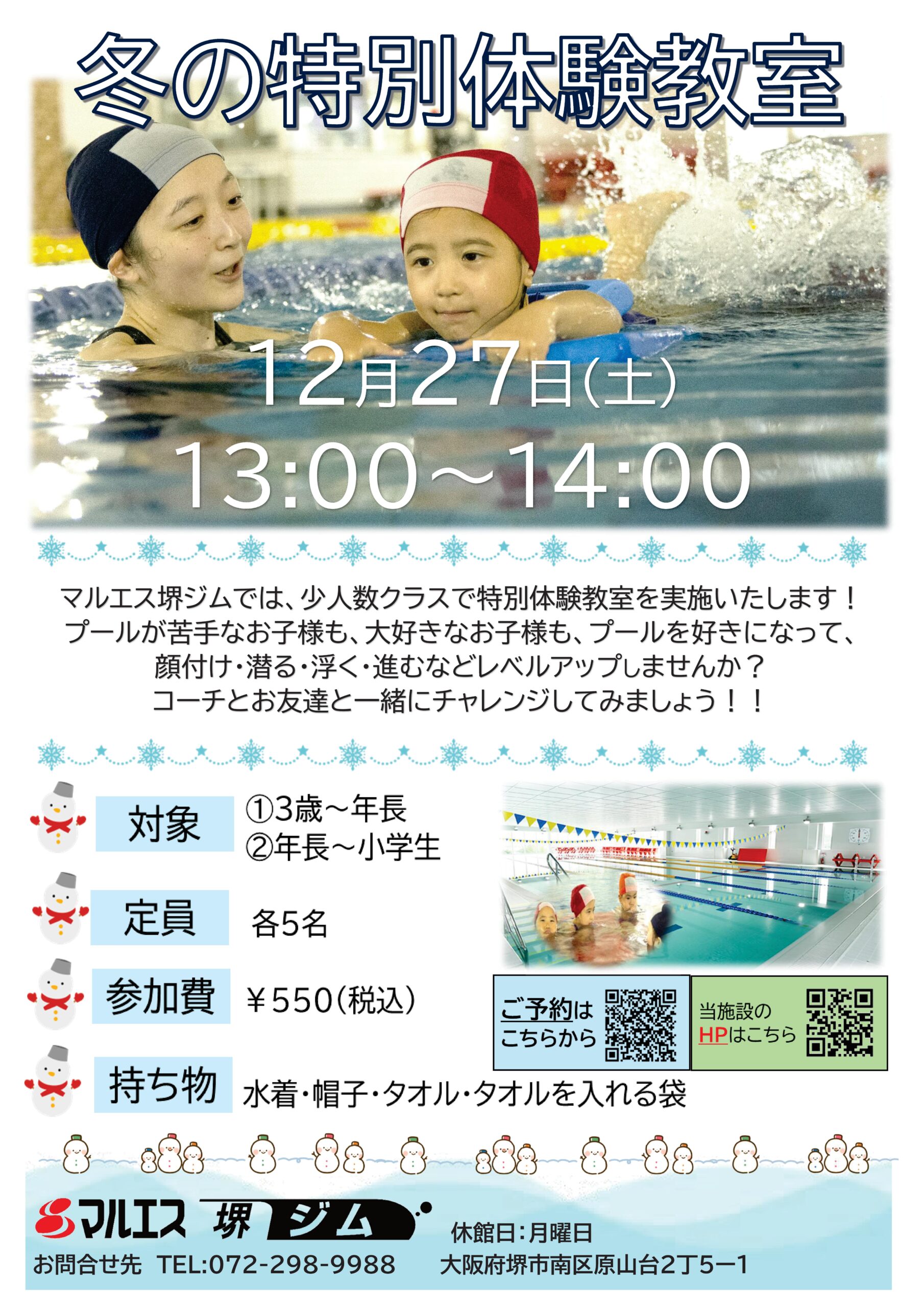 2025.11.01 冬の特別体験教室開催!! 各5名様限定!!! 少人数制レッスンとなります。 お申込みはコチラ 駐車場も完備しています。 自然豊かな場所に囲まれた当施設、 マルエス堺ジムで習い事を始めませんか?! ご不明点やご質問等ございましたらお問合せ下さい。 また、予約後は当施設フロントにてお支払いの程、宜しくお願い致します。